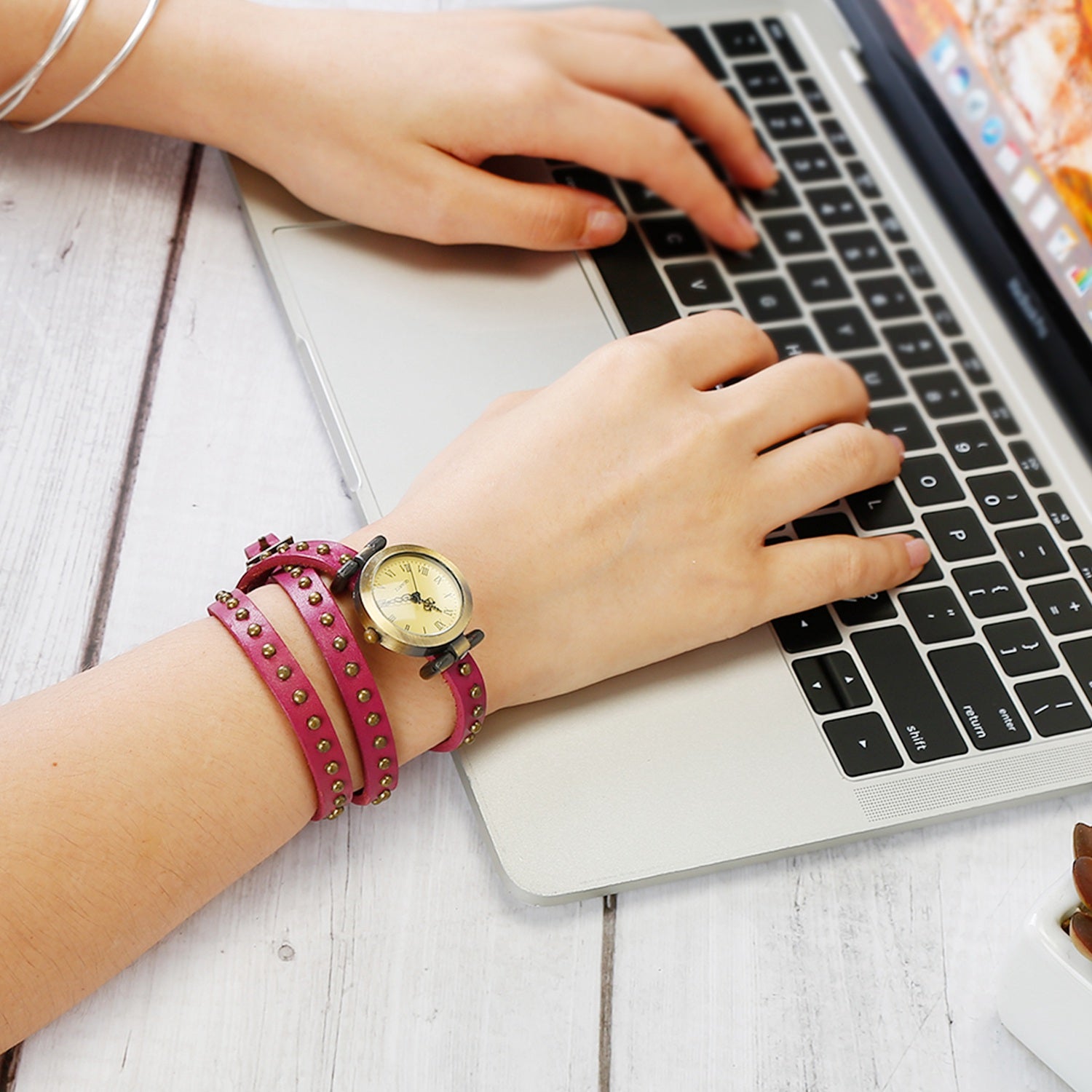 Fashionable Rivet Leather Belt Retro Watch Hand Chain-Pink Co